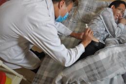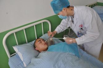 护士正在通过鼻饲管为病人输营养液
